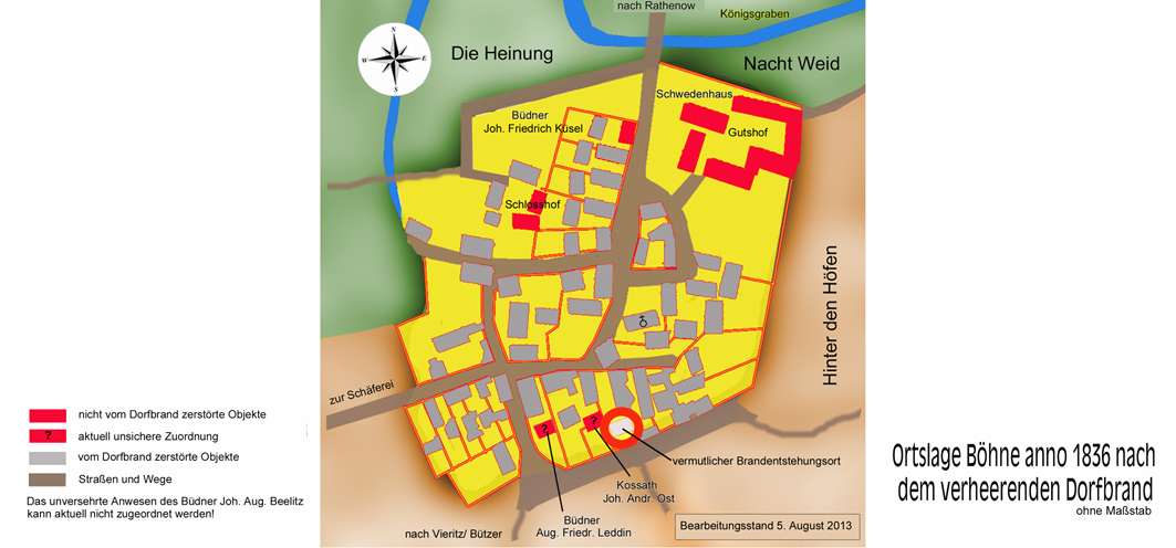 Mit dem 28. August 1836 begann für die Einwohner des Ort Böhne eine sehr schwierige und besonders entbehrungsreiche Zeit. Denn spätabends zwischen 22:00 und 23:00 Uhr brach in der Scheune des Kossaten und Schmiedemeister Johann Wilhelm Gottfried Ost ein Feuer aus. Dieses griff, angefacht durch den Wind erst aus Ost dann auf Süd drehend, schnell um sich. Unaufhaltsam fraßen sich die Flammen immer weiter in den Ort hinein und hinterließen eine breite Schneise der Verwüstung.
