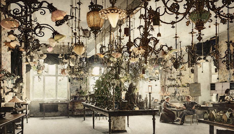 Blick in ein Fachgeschäft für Innen- und Außenleuchten im frühen 20. Jahrhundert. Sammlung Wodtke, KI-optimiert
