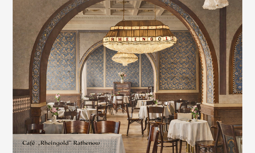 Riesige Leuchten brachten im Rathenower Cafe „Rheingold“ nicht nur das nötige Licht, sondern waren auch gestalterische Elemente, die den großen Räumen die gewünschte Nobles gaben. Sammlung Wodtke, KI-optimiert