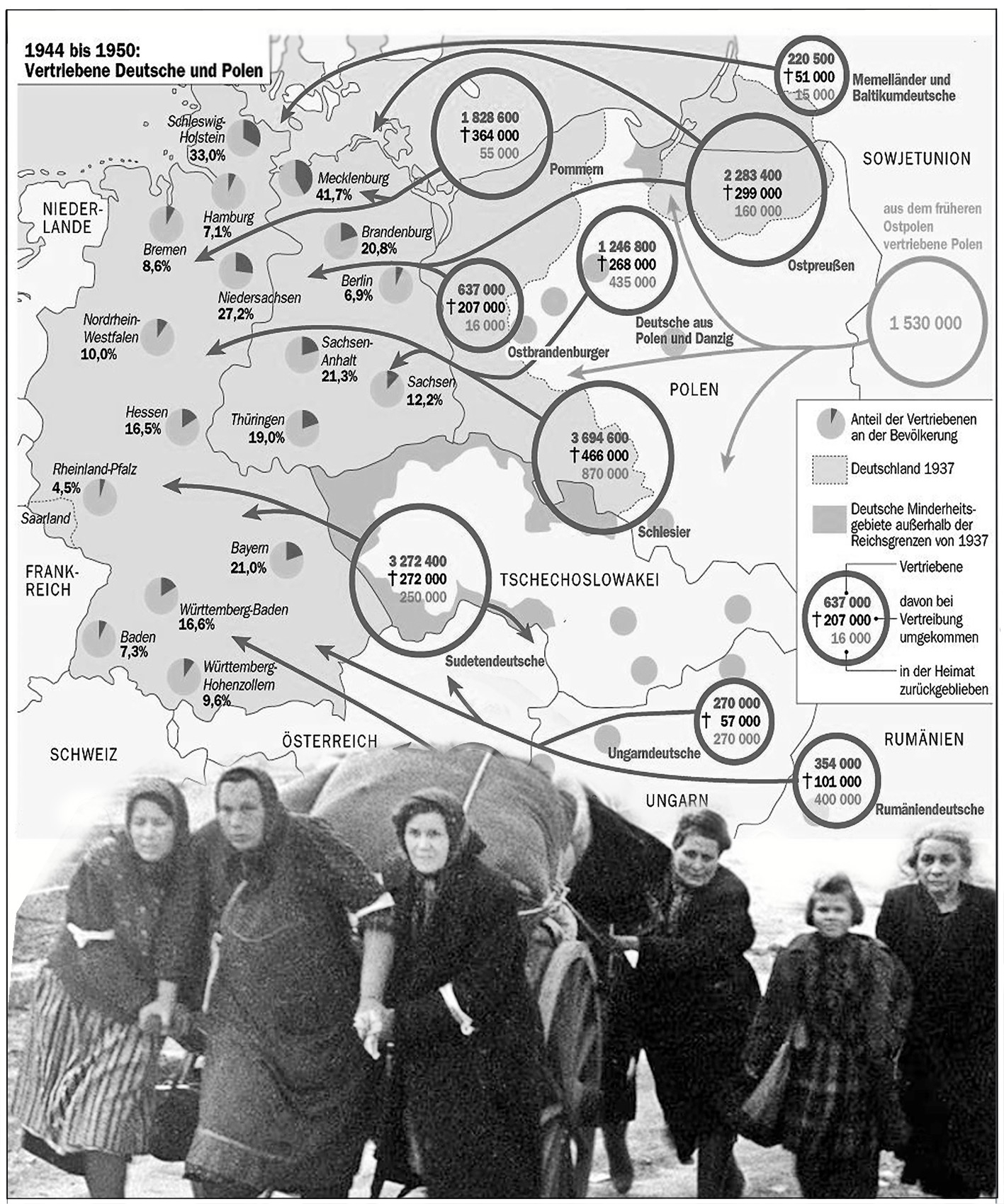 Mehr als 12 Millionen Deutschstämmige aus Ost- und Südosteuropa verloren ihre Heimat. Bildcollage: WodtkeAm 22. Juni 1941 überfiel das faschistische Deutschland die sich in argloser Sicherheit wiegende Sowjetunion. Die deutschen Soldaten und ihre Verbündeten hinterließen von Beginn des Krieges an besonders unter der Zivilbevölkerung eine Schneise des Elends, der Versklavung und des Todes. Ab Sommer 1944 schlug das Pendel der Gewalt zurück. Die sowjetischen Truppen drängten die deutsche Wehrmacht bis an die Grenze Ostpreußens. Das NS-Regime verbot zunächst, mit wenigen Ausnahmen für die unmittelbare Grenzregion, Evakuierung und Flucht.