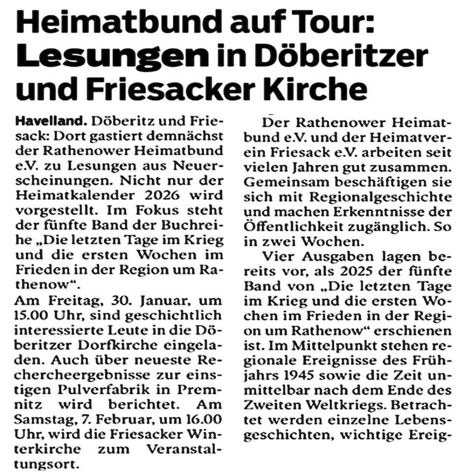 Lesung zum Kriegsende in der RegionDer Rathenower Heimatbund e.V. und der Friesacker Heimatverein e.V. laden zur Buchlesung ein. Schwerpunktthema der Lesung ist das Kriegsende in der Region um Friesack. Grafik Wodtke, mit KI-Unterstützung generiertDer Rathenower Heimatbund e.V. lädt gemeinsam mit dem Friesacker Heimatverein e.V. zu einer besonderen Buchlesung ein. Dabei lassen in Friesack mehrere Referenten die letzten Tage des Zweiten Weltkriegs und die ersten Wochen danach noch einmal lebendig werden.Quelle: intern / 13. Januar 2026Autor: WodtkeZeitzeugen, historische Rückblicke und spannende Geschichten aus unserer RegionBuchlesung in Friesack zum Kriegsende in der RegionFriesack | 7. Februar 2026 | 16:00 UhrOrt: Gemeindesaal der Kirche, Charlottenstraße 2–4Partner: Heimatverein Friesack & Rathenower HeimatbundProgramm-Highlights:• Rathenower Heimatkalender 2026 – Wolfram BleisLesungen aus „Die letzten Tage im Krieg und die ersten Wochen in der Region um Rathenow“, u.a.:• Aus Ostpreußen nach Ohnewitz – Sybille Speitel• Kriegsende in Friesack – Sven Leist• Friesacker Kirchenbrand 1945 – Petra Gläsel• Polnische Soldaten an Havel & Elbe – Karl Reinhold GranzowModeration: Gerd DehnhardtDer Eintritt ist frei – Spenden willkommen!Im Anschluss können die vorgestellten Broschüren und weitere regionalgeschichtliche Printprodukte erworben werden. BRAWO-Beitrag vom 24.Januar 2026, Teil 1-3 BRAWO-Beitrag vom 24.Januar 2026, Teil 2-3 BRAWO-Beitrag vom 24.Januar 2026, Teil 3-3