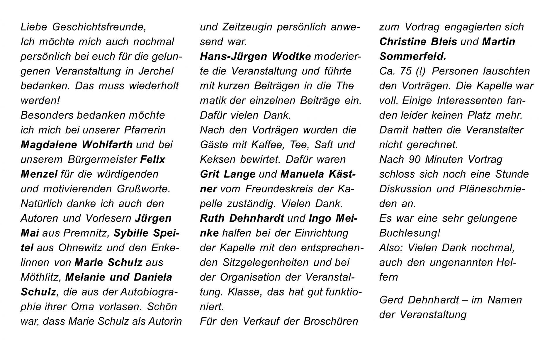 Die in Jerchel stattgefunden zweiten Veranstaltung zum Inhalt der 5. Broschüre „Die letzten Tage im Krieg und die ersten Wochen im Frieden in der Region um Rathenow“ unterschied sich zu der im Mai des Jahres in Rathenow präsentierten Lesung erheblich und bot so auch den dort bereits anwesenden Zuhörern durchaus neues an Informationen.