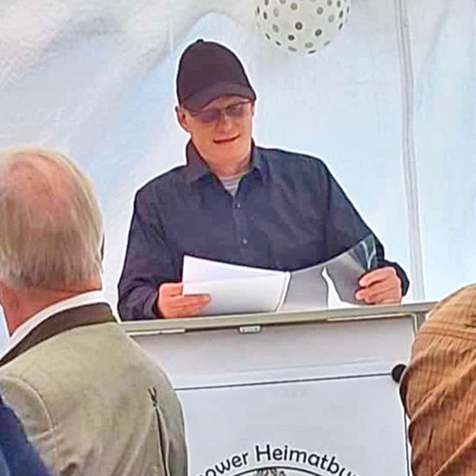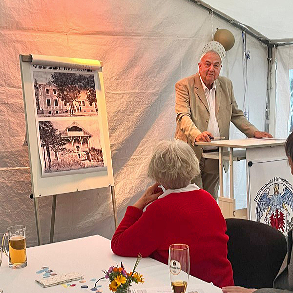 Vereinsmitglied Hans-Jürgen Wodtke und Urgestein des Wilhelminenhofes erinnerte im Anschluss an den Architekten und Gutsbesitzer Karl Zeisberg. Dieser war nicht nur Besitzer des Wilhelminenhofes, sondern auch in der frühen Vereinsphase aktives Mitglied des Rathenower Heimatbundes.