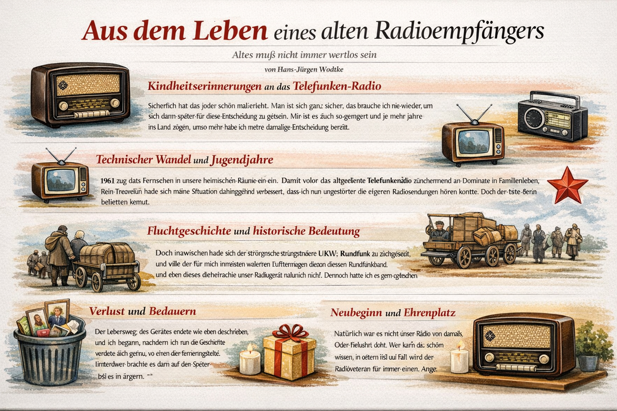 Kurztext: Ein altes Telefunken-Radio begleitete die Familie des Erzählers durch die Kriegs- und Fluchtzeit. Trotz vieler Gefahren und der Umstände wurde es nie aufgegeben. Erst viel später, als der Erzähler das Radio entsorgt hatte, erkannte er dessen wahre Bedeutung. Zu seinem 65. Geburtstag erhielt er von seiner Familie ein gleichartiges Radio als Geschenk.